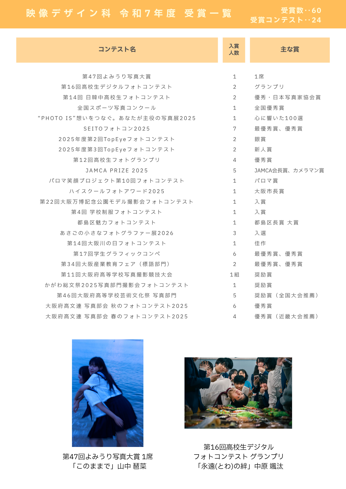 令和7年度、映像デザイン科の生徒たちが各種コンテストで受賞しました。 受賞結果を一覧で紹介します。 関連リンク 第47回 よみうり写真大賞 中高生フォト部門 受賞作品 第16回 高校生デジタルフォトコンテスト 結果発表